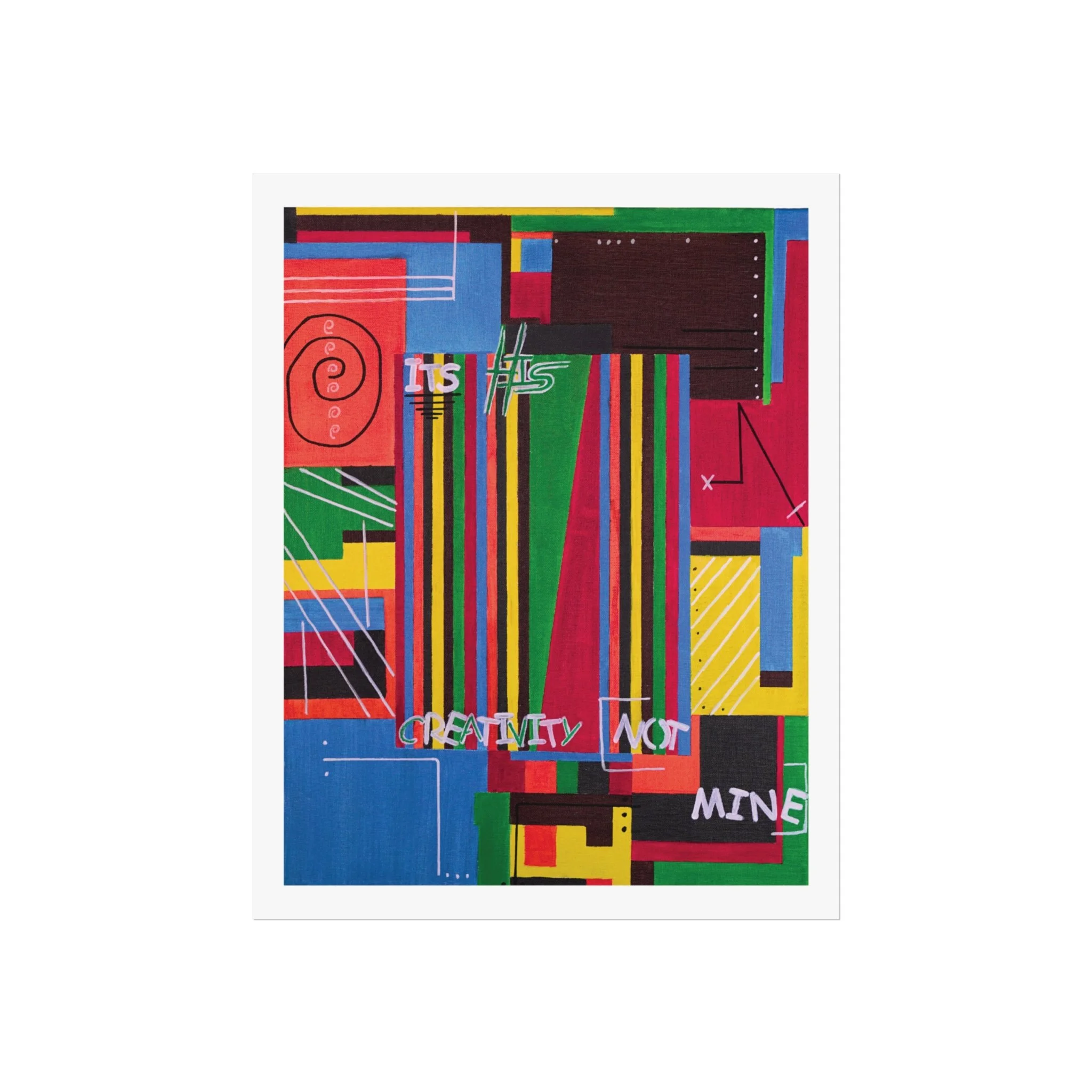 Layered color, lines, and patterns clash and connect, spelling out “it’s His creativity, not mine,” with a remembrance on where the real spark comes from.